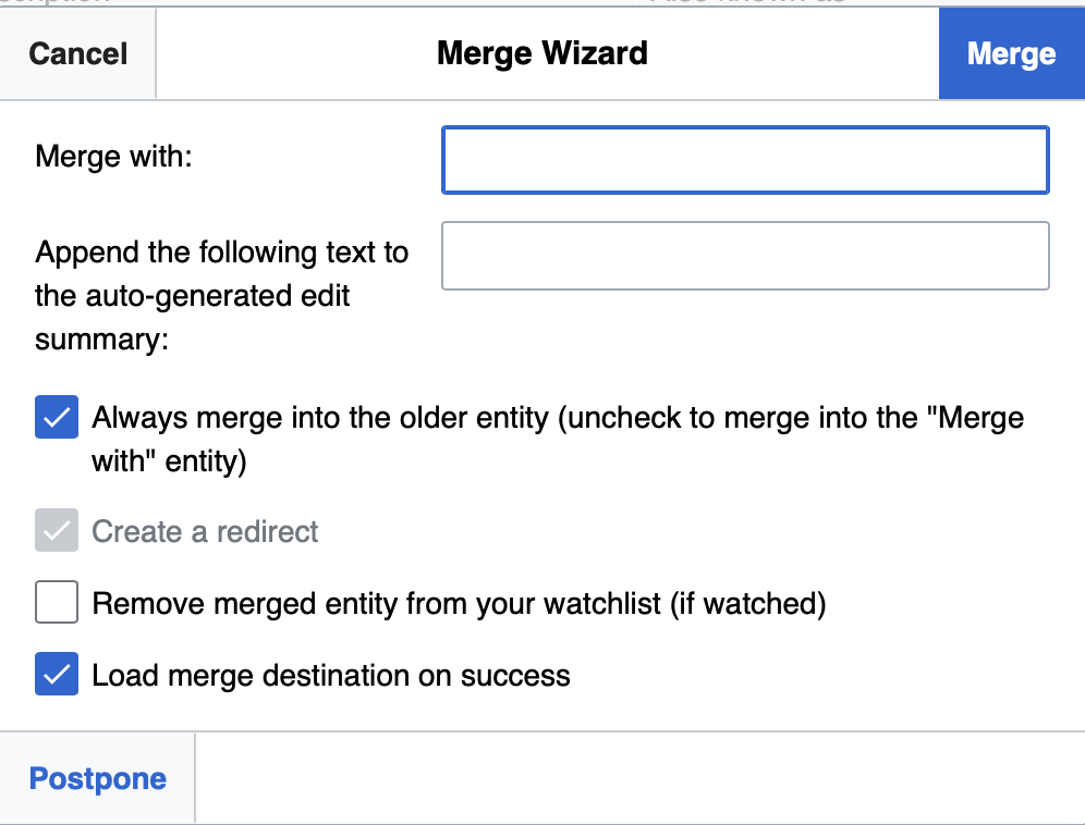Enter the QID of the best one into the Merge with text field, and you uncheck the “Always merge into the older entity”. The latter is the default and depending on the result you want, you can end up with the QID of the newer, or inferior, item being used. It’s not critical, as we will see.